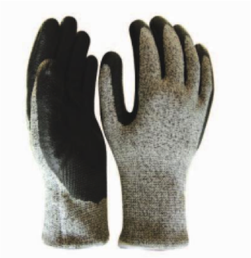 TPR impact resistant glove: EN cut5 liner in salt&pepper color,black color sandy nitrile palm coating,double dip. TPR stitched on back for impact resistance |
